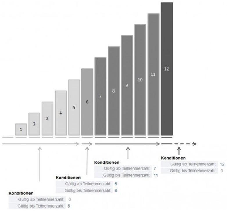 Jeder Preis wird gemäß der aktuellen Teilnehmerzahl auf seine Gültigkeit überprüft. Bei einer Teilnehmerzahl von elf wären die Preise „bis 5“, „6-6“ und „ab 12“ inaktiv.
