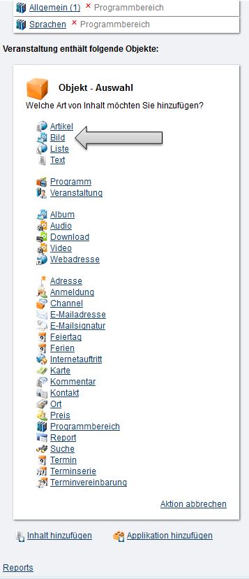 Alternativ können Sie auch über die Applikation „Inhalte“ ein Bild unter dem Veranstaltungstext einfügen. Hierzu bitte die Applikation öffnen/anklicken und dann den Link „Inhalt hinzufügen“ anklicken.