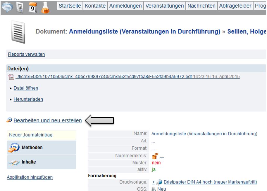 Nachdem die Detailseite des Dokuments angezeigt wird, kann es nach anklicken des Links „Bearbeiten und neu erstellen“ individuell verändert werden.