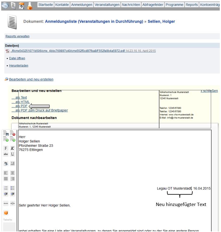 Nach der Bearbeitung z.B. auf den Link „… als PDF“ klicken, um das neue Dokument zu erstellen.