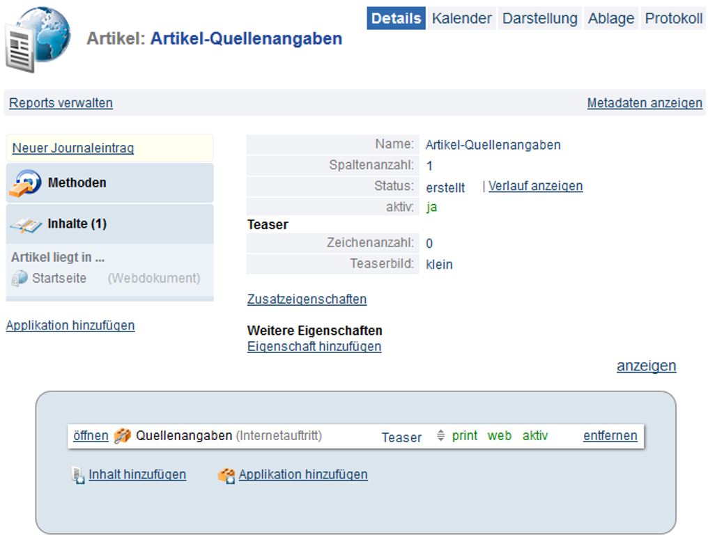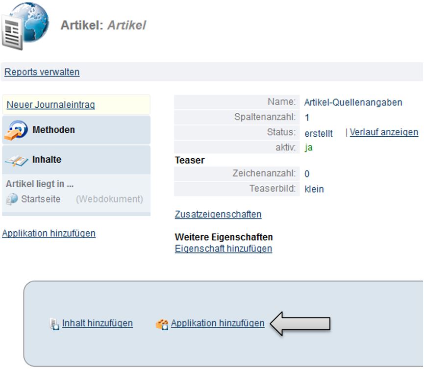 Um nun die Quellenangaben als Link im Internetauftritt einzubauen, bietet es sich an, hierfür einen eigenen Artikel zu erstellen z.B. im Bereich „Zusatzinhalte“ des Webdokumentes „Startseite“. In diesem Artikel wird über den Link „Applikation hinzufügen“ die Applikation „Quellenangaben“ hinzugefügt.