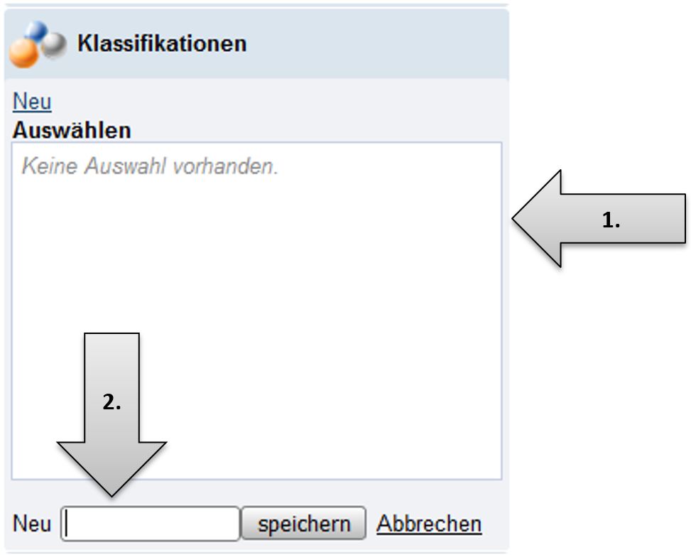 Nun kann entweder eine bereits existierende Klassifikation ausgewählt werden (Pfeil 1.) oder eine neue Klassifikation erstellt werden (Pfeil 2.).