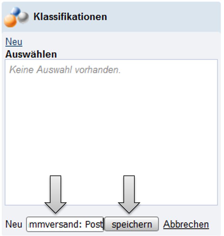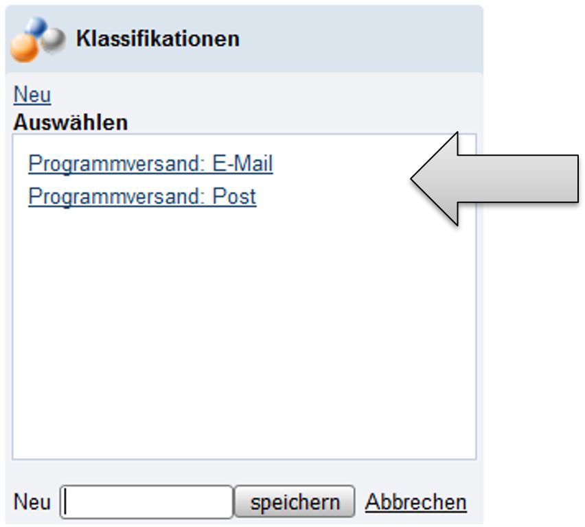 Erstellt man eine neue Klassifikation z.B. „Programmversand: Post“, wird der Name in das Feld „Neu“ eingegeben und danach durch einen Klick auf die Schaltfläche „speichern“ gespeichert.