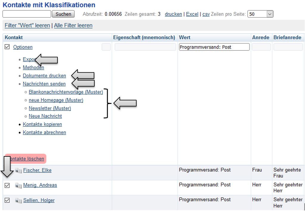 Nun die entsprechenden Kontakte abhaken und über die Links „Optionen“ => „Dokumente drucken“ die entsprechende Dokumentvorlage auswählen oder über „Optionen“ => „Nachrichten senden“ eine entsprechende Nachrichtenvorlage auswählen, um die Kontakte anzuschreiben resp. zu benachrichtigen.