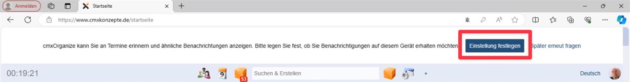 Wenn die Anzeige mit dem Hinweis erscheint, dass Edge Ihnen Benachrichtigungen schicken und Sie an Termine erinnern kann, klicken Sie bitte auf “Einstellung festlegen”