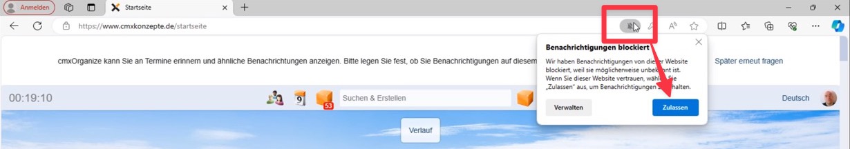 Um in Microsoft Edge Benachrichtigungen zu Ihren Terminen zu aktivieren, wenn der Browser Sie fragt, sind die folgenden beiden Schritte nötig: