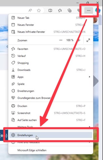 Klicken Sie auf die drei Punkte oben rechts in der Adressleiste und wählen Sie “Einstellungen” aus dem Dropdown-Menü