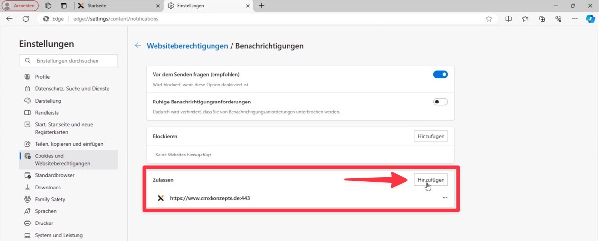 Geben Sie in dem sich öffnenden Dialogfenster Ihre vollständige Webadresse (inkl. https:// am Anfang, also z. B. “Https://www.cmxkonzepte.de”) ein und bestätigen Sie mit einem Klick auf “hinzufügen”.