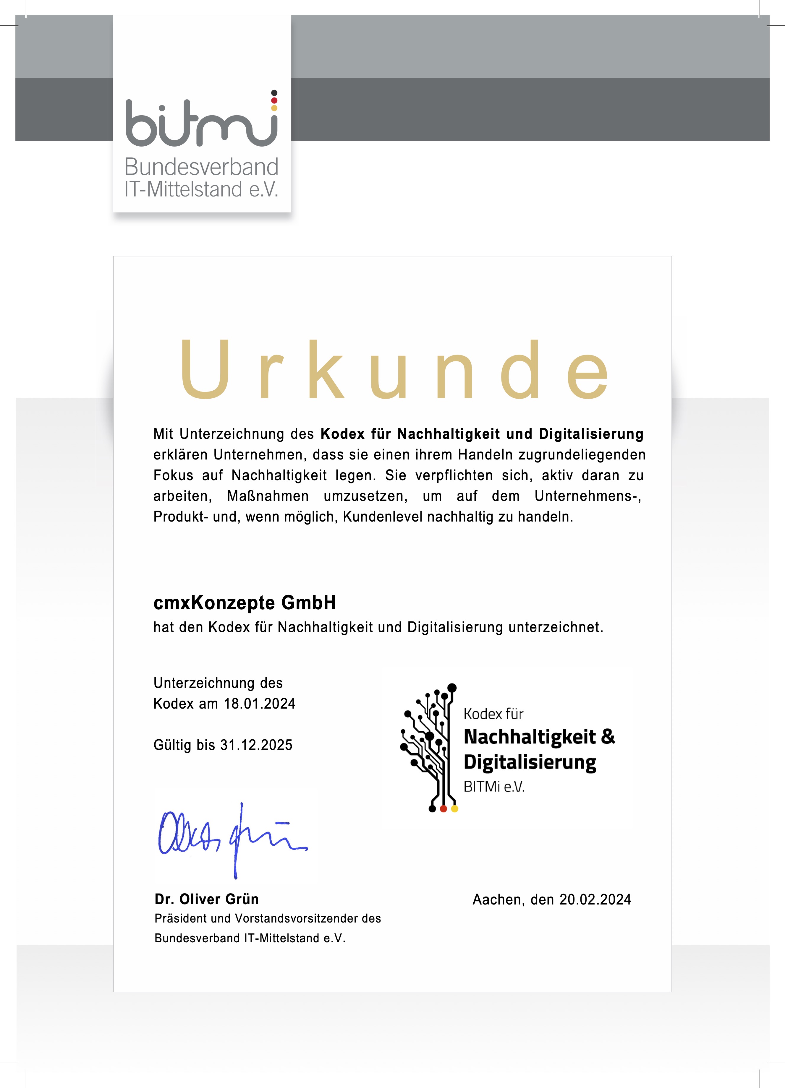 Mit Unterzeichnung des Kodex für Nachhaltigkeit und Digitalisierung erklären wir, dass wir einen unserem Handeln zugrundeliegenden Fokus auf Nachhaltigkeit legen. Wir verpflichten uns, aktiv daran zu arbeiten, Maßnahmen umzusetzen, um auf dem Unternehmens-, Produkt-, und, wenn möglich, Kundenlevel nachhaltig zu handeln.